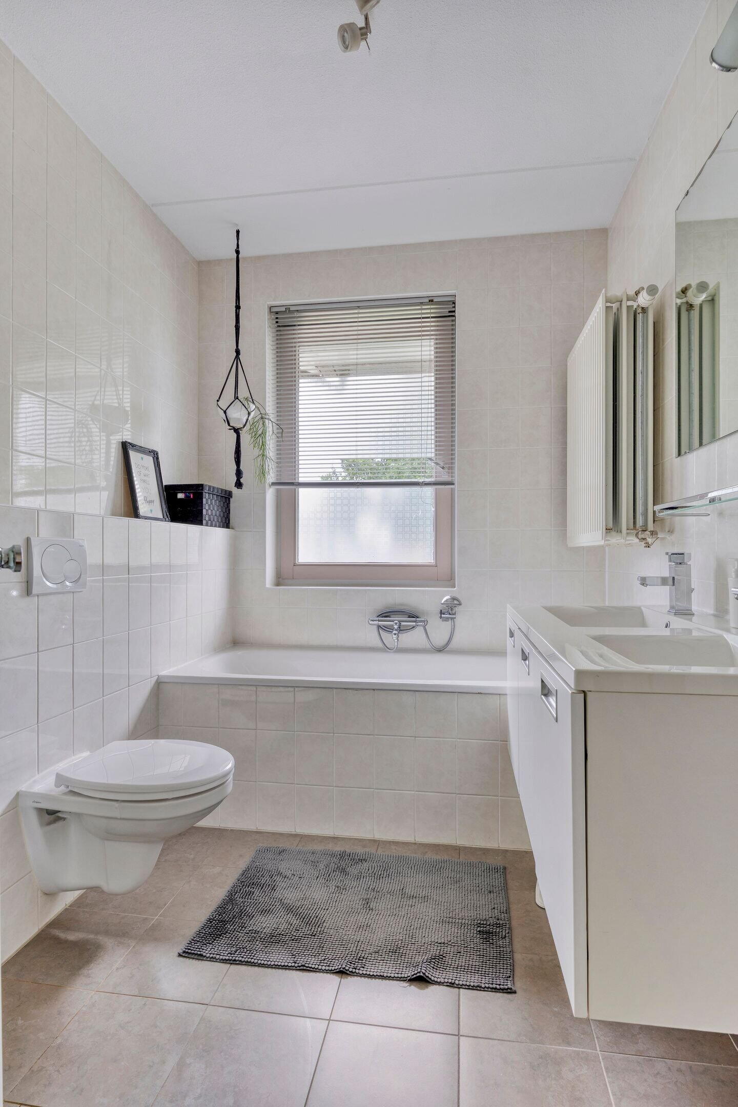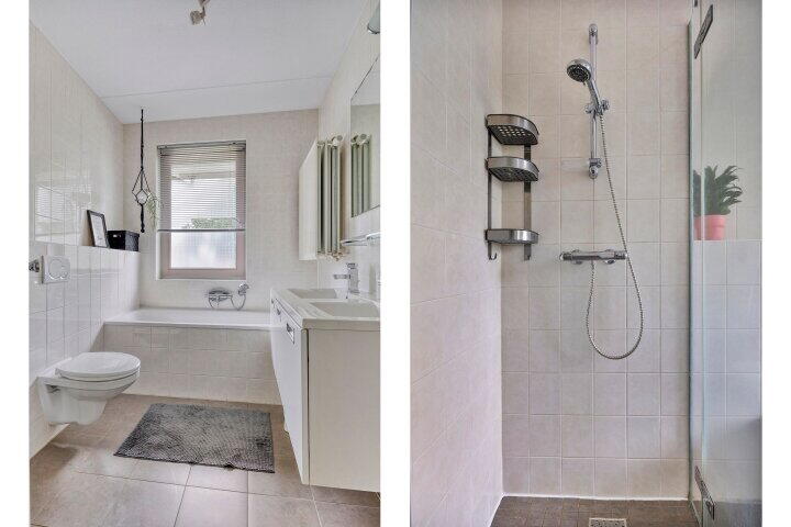 - Dubbele wastafel, inloopdouche, ligbad, toilet, en wastafelmeubel