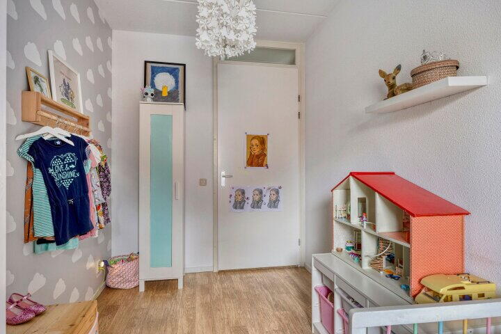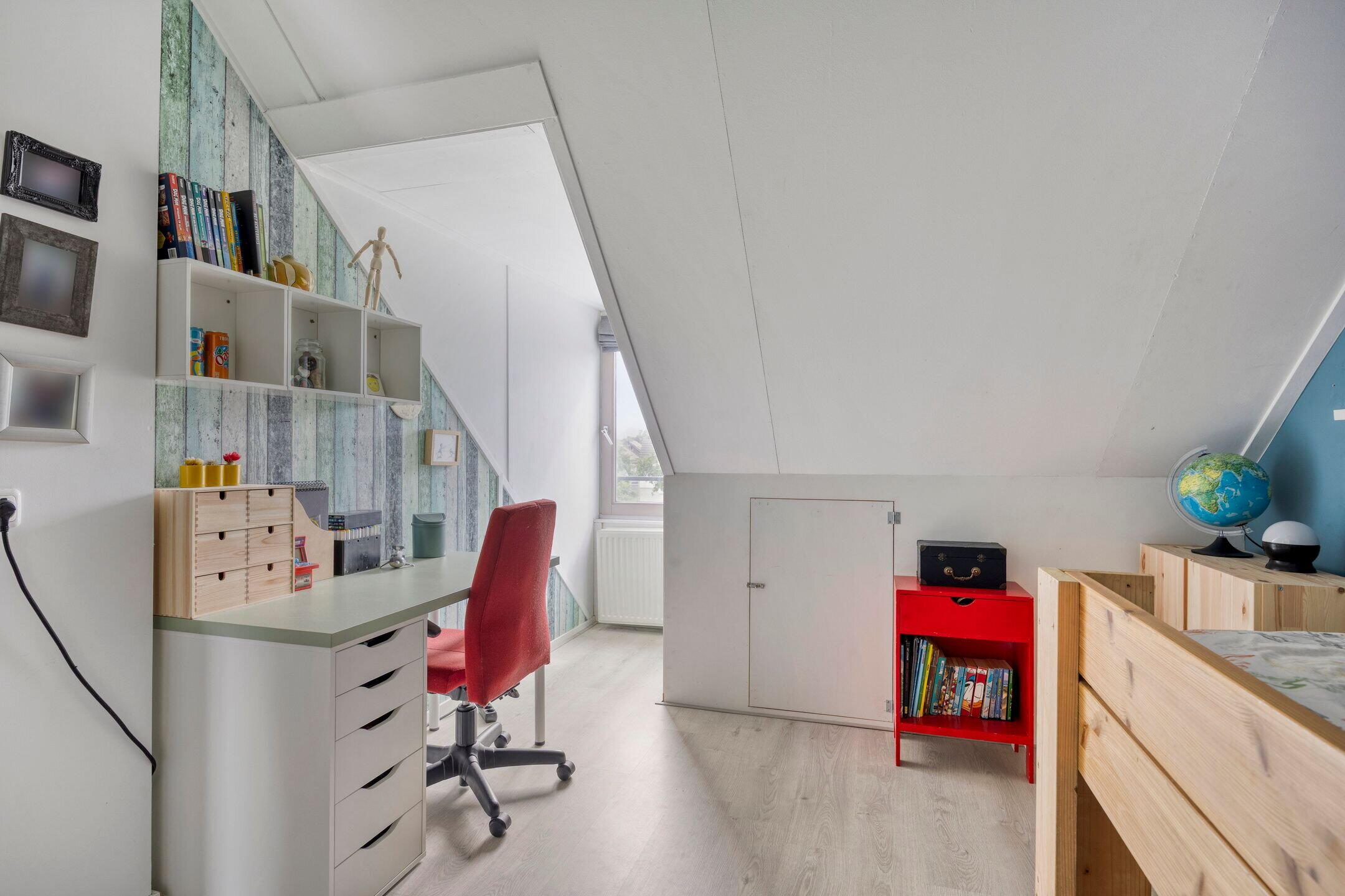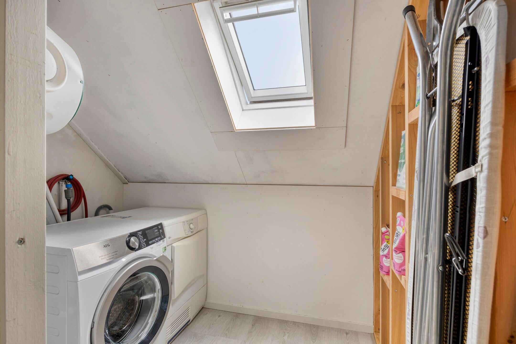 Drie slaapkamers, ruimte met witgoedaansluitingen en CV-ketel en veel bergruimte achter de knieschotten. Dankzij twee extra dakramen en een dakkapel hebben alle slaapkamers voldoende daglichttoetreding.