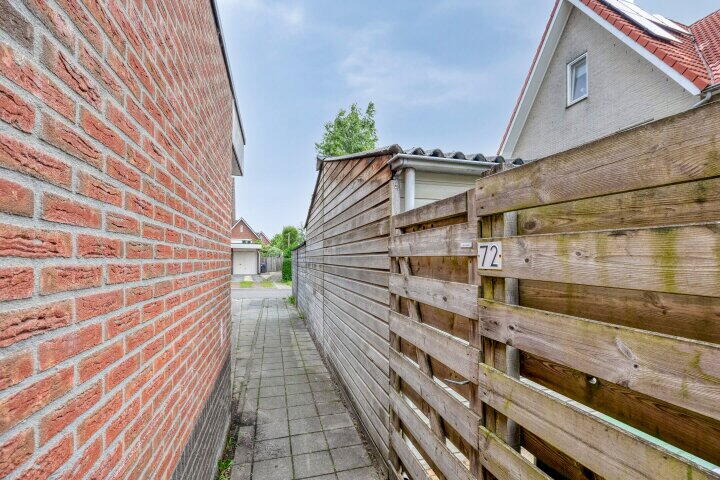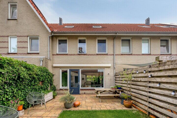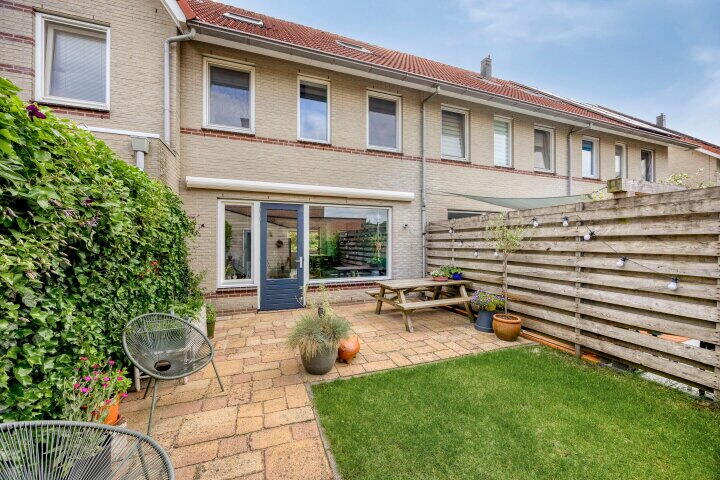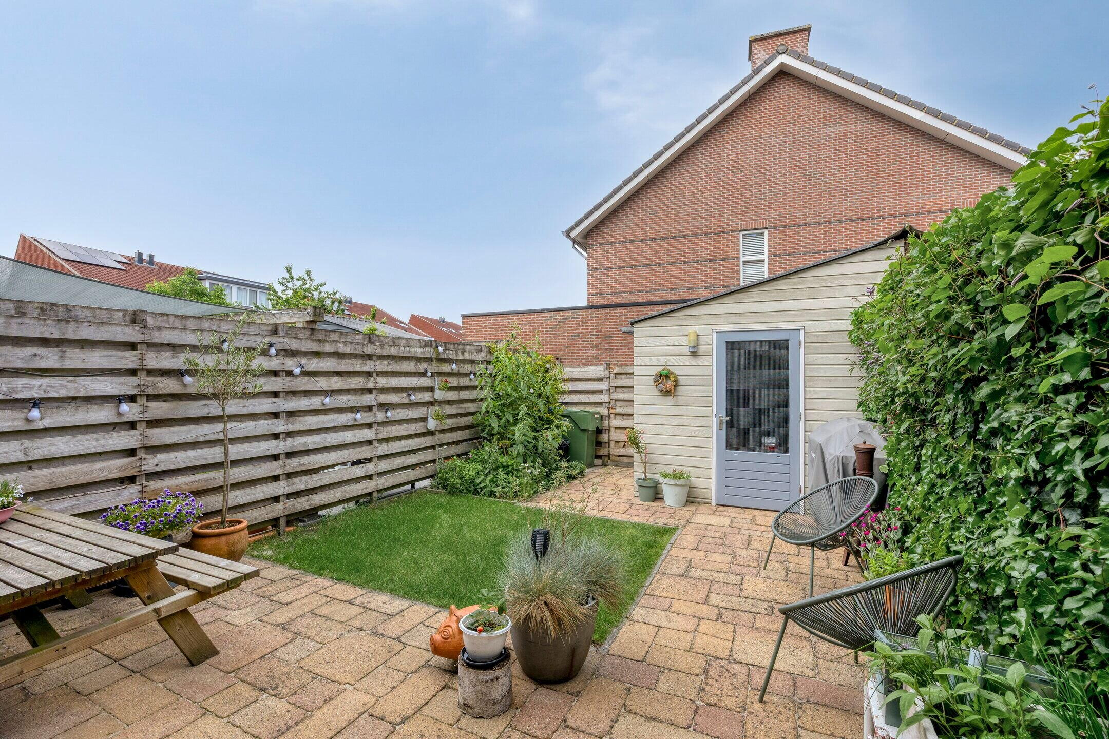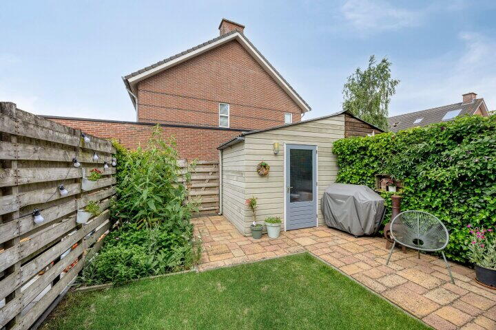 De woning beschikt over een diepe voortuin en een zonnige achtertuin op het zuidwesten. Hier geniet je van veel privacy en een prettige buitenruimte. In de achtertuin vind je een vrijstaande houten berging, ideaal voor het opbergen van fietsen of tuinspullen. Dankzij de achterom is de tuin ook via de achterzijde bereikbaar.